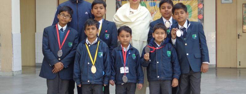 Pratyaksh Jain of class 3 won one gold & one Silver in under-8 inline (300, 500 mtrs),Manit Jain of class KG won two Bronze in under -6 Quads (300,500 mtrs), Kautik Agarwal of class 1 won one silver & one Bronze in Under -6 Adjustable (300,500 mtrs ), Sanket Goel of class 6 won one Silver & one Bronze medal in Under -12 inline (300,500 mtrs), Manit Bansal of class 3 won one Bronze medal in under -8 inline (500 mtrs), Pranay Kapahi of class 1 won one Bronze Under-8 inline (300 mtrs), Surya Nagar of class 4 won one Gold & One Silver medal in under -10 Quads (300, 500 mtrs) and Alok Baisla of class 1 won One Gold & one Silver medal in under -6 Adjustable (300, 500 mtrs) in Invitational UP State Open Roller Skating Championship 2016 held at IIMT Academy , Meerut on 25 December 2016.