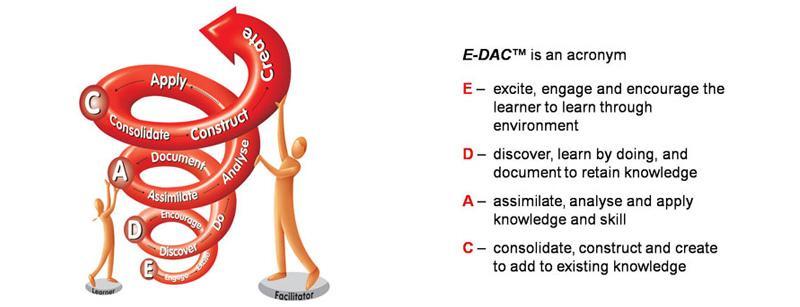 The driving force behind the Takshila schools is its progressive learning system, E-DAC. The sole aim of this learning system is to make learning effortless and effective with the help of various audio, visual and kinaesthetic learning tools and techniques. The system is innovative in its approach as it is designed to make learning an engaging and experiential process for all learners. It is the outcome of intensive research by Educomp’s Research and Development division. Though E-DAC is an acronym for the four-fold process of learning that takes a learner through various stages of learning, the process itself is a never-ending spiral, a continuum that may begin at any point but one that never ends, thus making lifelong learners.